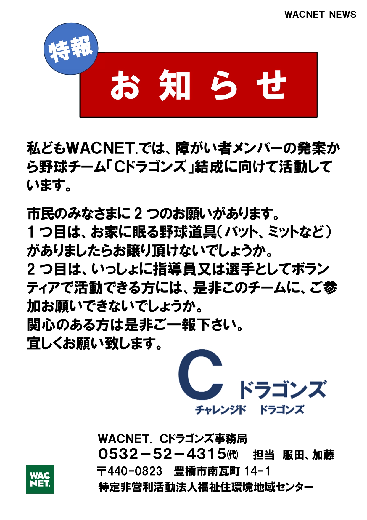 ●WAC野球チームC(challenged)ドラゴンズからのお知らせ
